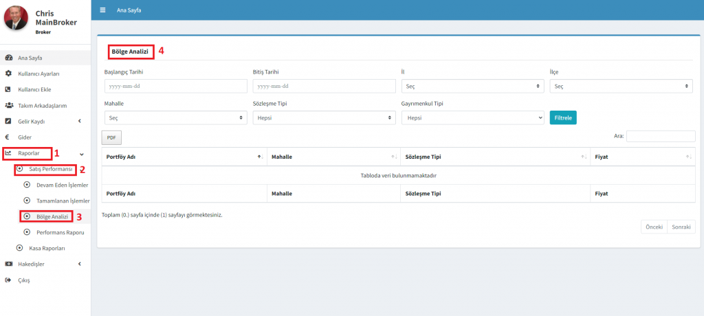4- Bölge analizi alanında istenilen tarihler arasında il, ilçe, mahalle, sözleşme tipi ve gayrimenkul tipi seçilerek filtreleme yapılır.