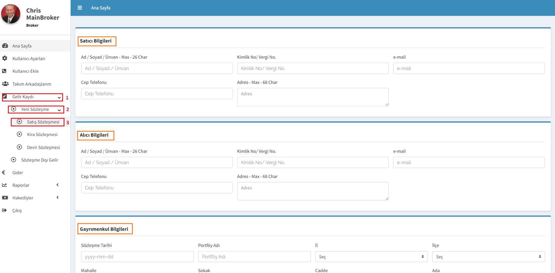 4- Satıcı, alıcı ve gayrimenkul bilgileri girilerek sözleşme kaydı tamamlanır.