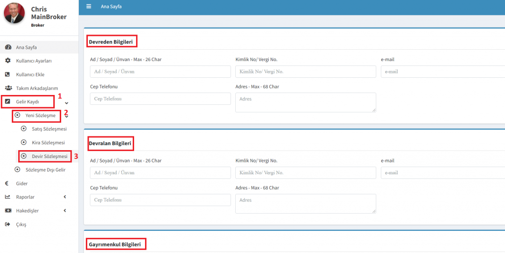 4- Devreden, devralan ve gayrimenkul bilgileri girilerek sözleşme kaydı tamamlanır.