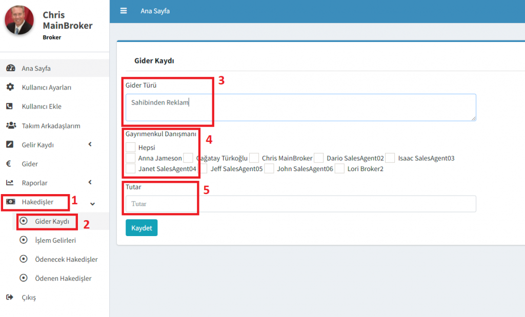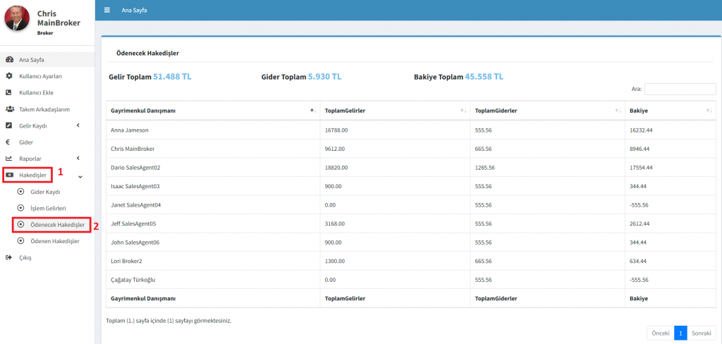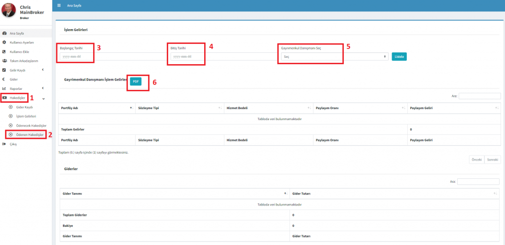9- Çıktı alınan pdf imzalatıldıktan ve danışmana hakediş ödendikten sonra sistem üzerinden hakedişi öde diyerek danışman gelir giderleri sıfırlanır.