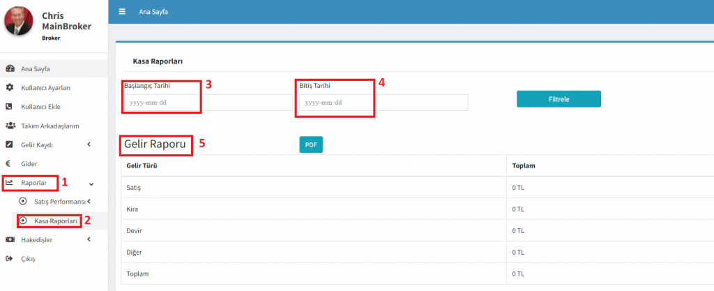 5- Seçilen filtrelemenin gelir raporu, pdf çıktısı olarak alınabilir.