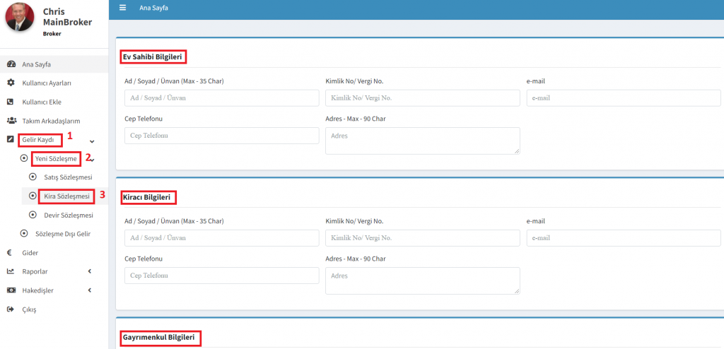 4- Ev sahibi, kiracı ve gayrimenkul bilgileri girilerek sözleşme kaydı tamamlanır.