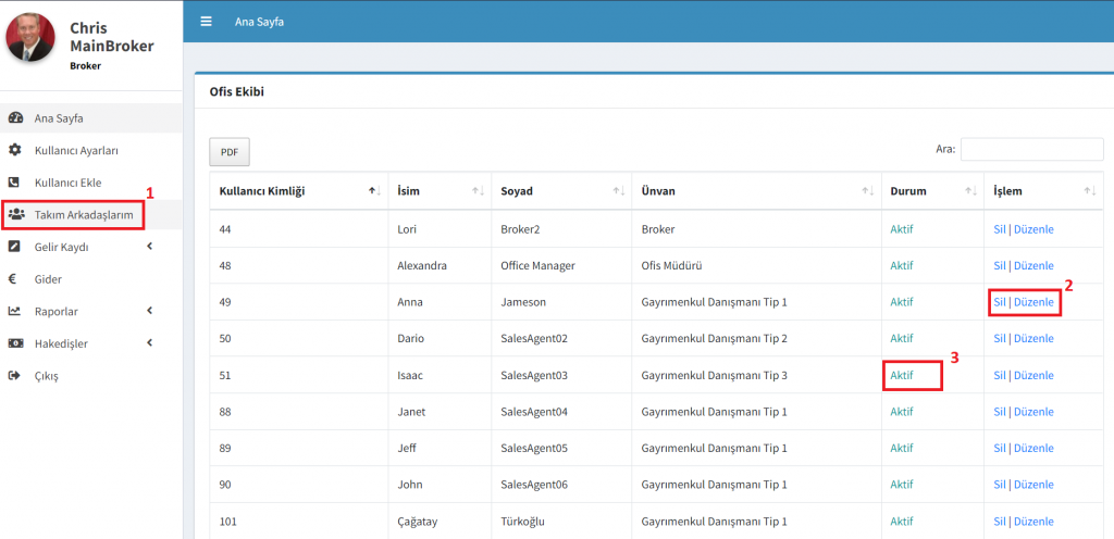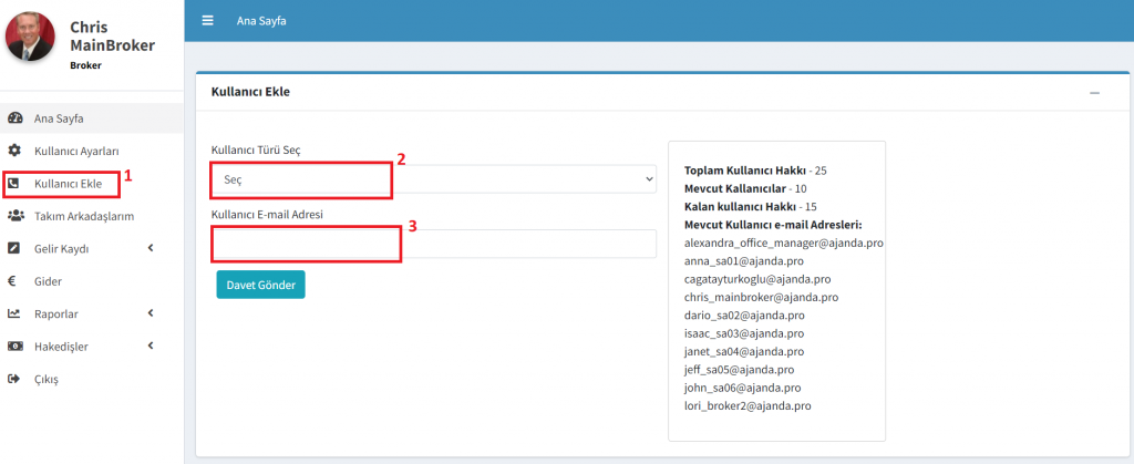 – Kayıt linki üzerinden doldurulan form gönderildikten sonra broker takım arkadaşları sekmesinden kullanıcıyı onaylamak zorundadır.