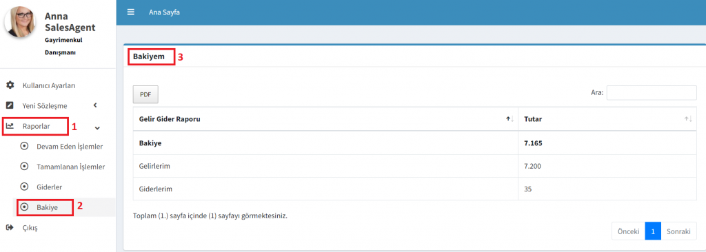3- Bakiyem alanında bir önceki hak edişten itibaren toplam gelir ve giderleriniz gözlemlenir.