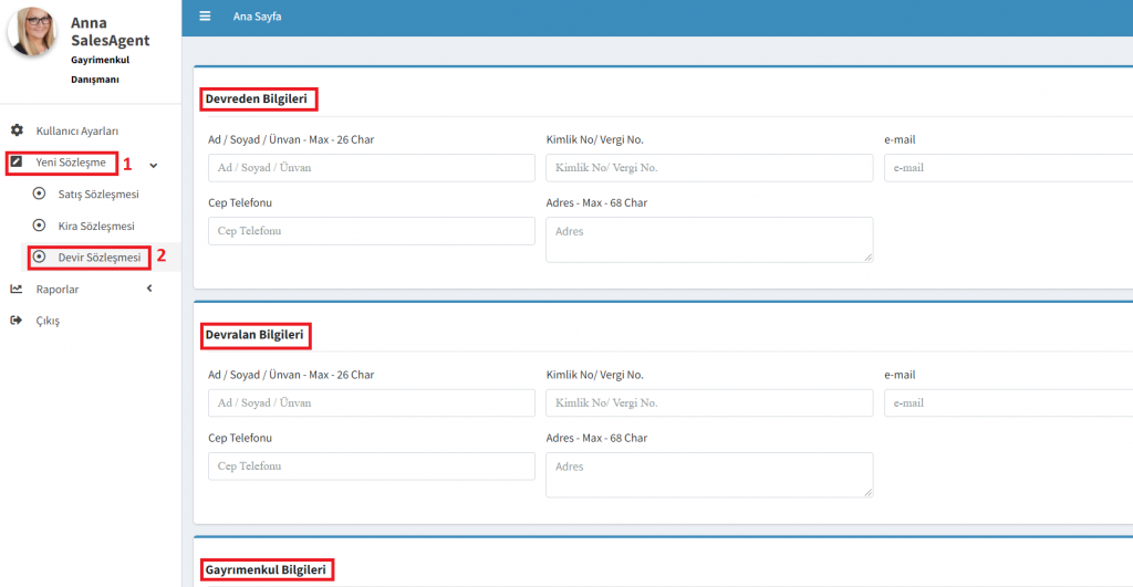 3- Devreden, devralan ve gayrimenkul bilgileri girilerek sözleşme kaydı tamamlanır.