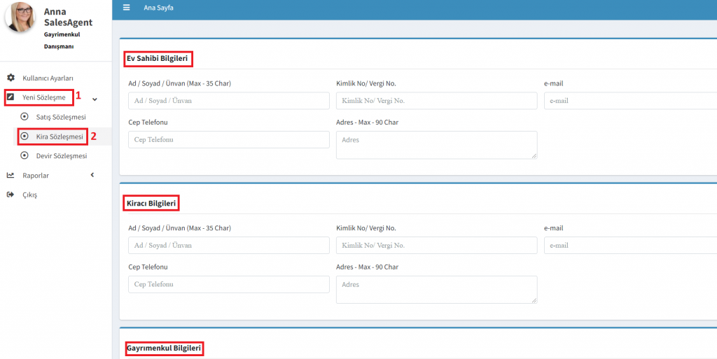 3- Ev sahibi, kiracı ve gayrimenkul bilgileri girilerek sözleşme kaydı tamamlanır.