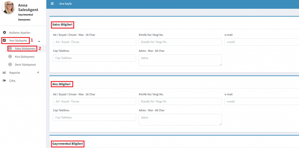 3- Satıcı, alıcı ve gayrimenkul bilgileri girilerek sözleşme kaydı tamamlanır.